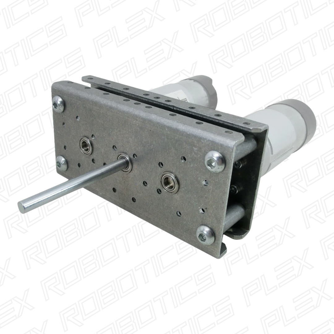 This gearbox accepts two NeveRest Classic gearmotors as its input, and has a robust steel 6 mm D shaft for it's output. The motors can be installed on each side of the output shaft, or the motors can be installed side by side with the output shaft installed on one of the ends of the gearbox.