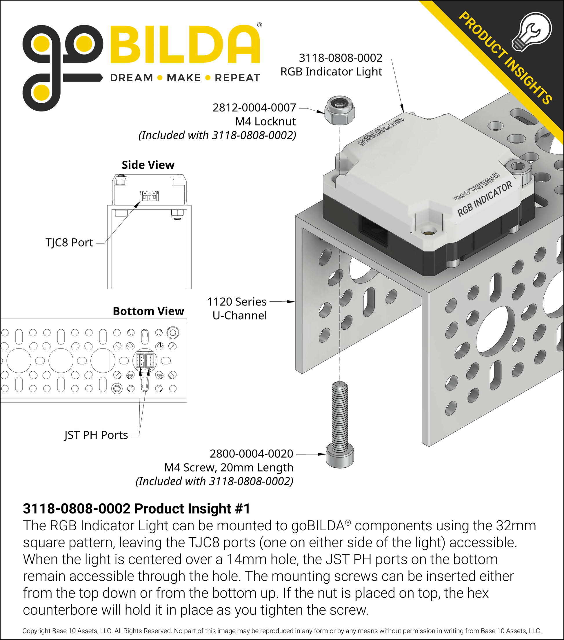 The RGB Indicator Light possesses four M4 thru-holes on the goBILDA® 32mm square pattern. Each thru-hole has a hex counterbore for the easy capture of hex head screws and locknuts.