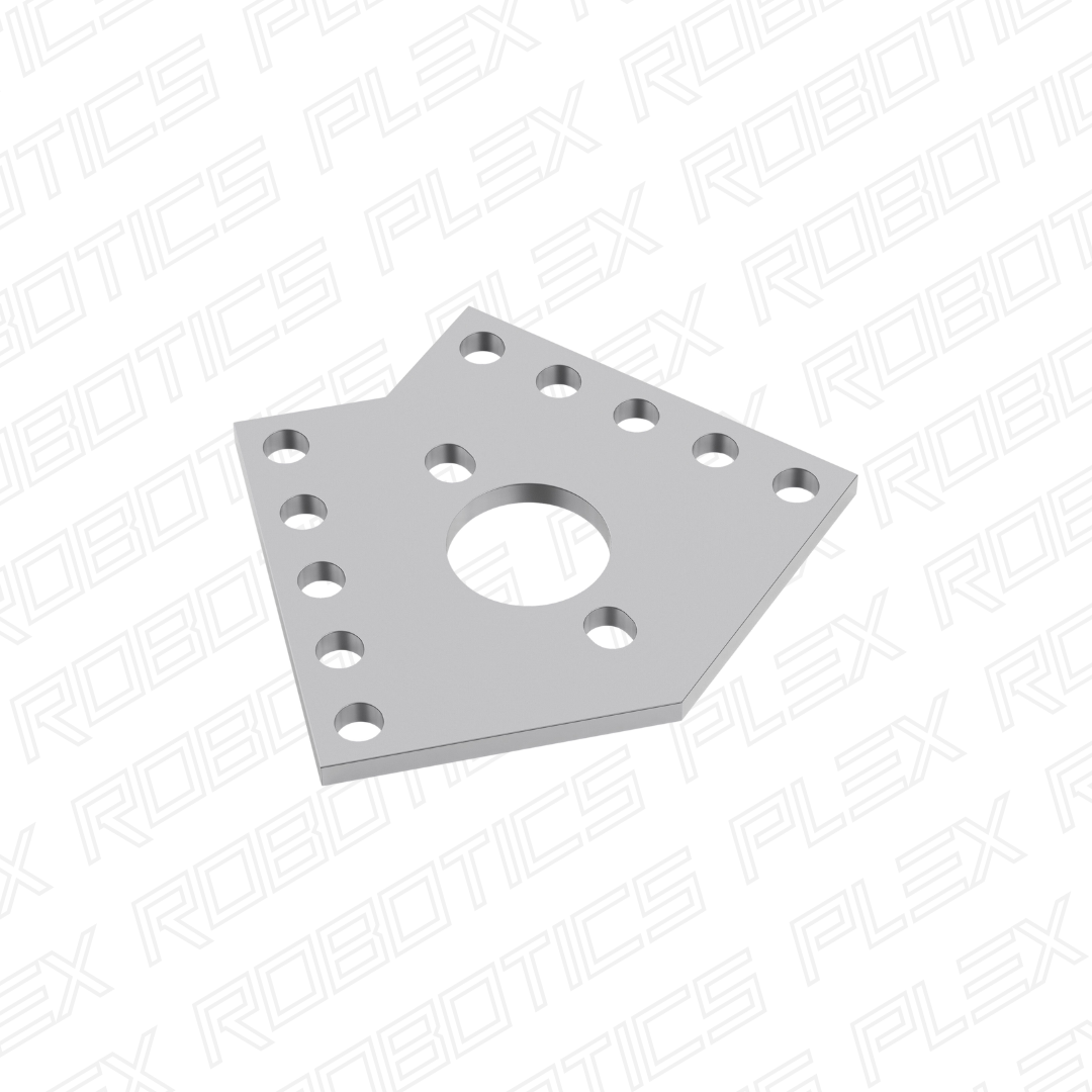 This flat pattern bracket allows you to create a 135 degree angle between two plates or pieces of channel. The five holes at each end are spaced 8mm apart so they will align with any grid-based part.