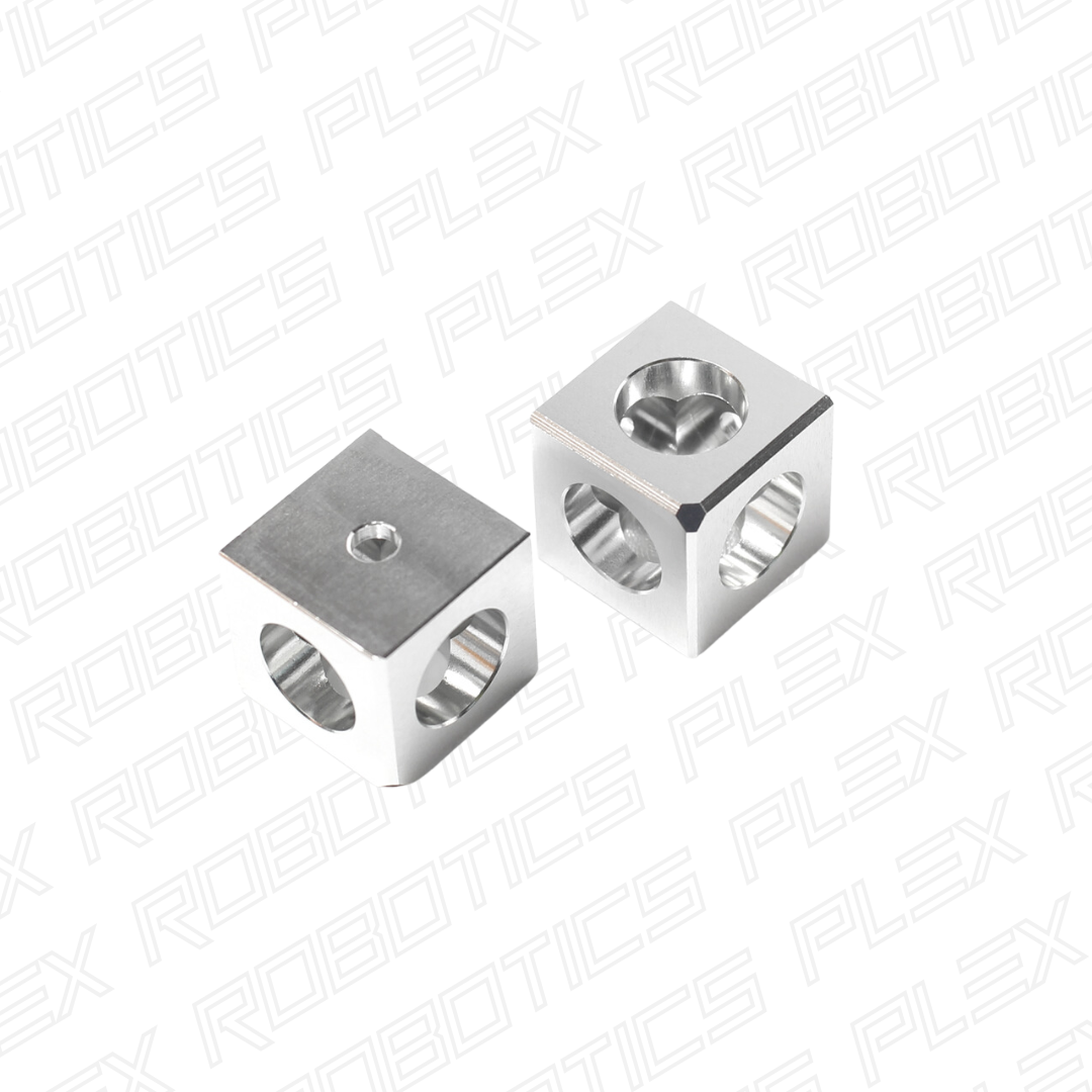 Aluminum cubes that allow users to quickly create square assemblies using REV 15mm Extrusion.