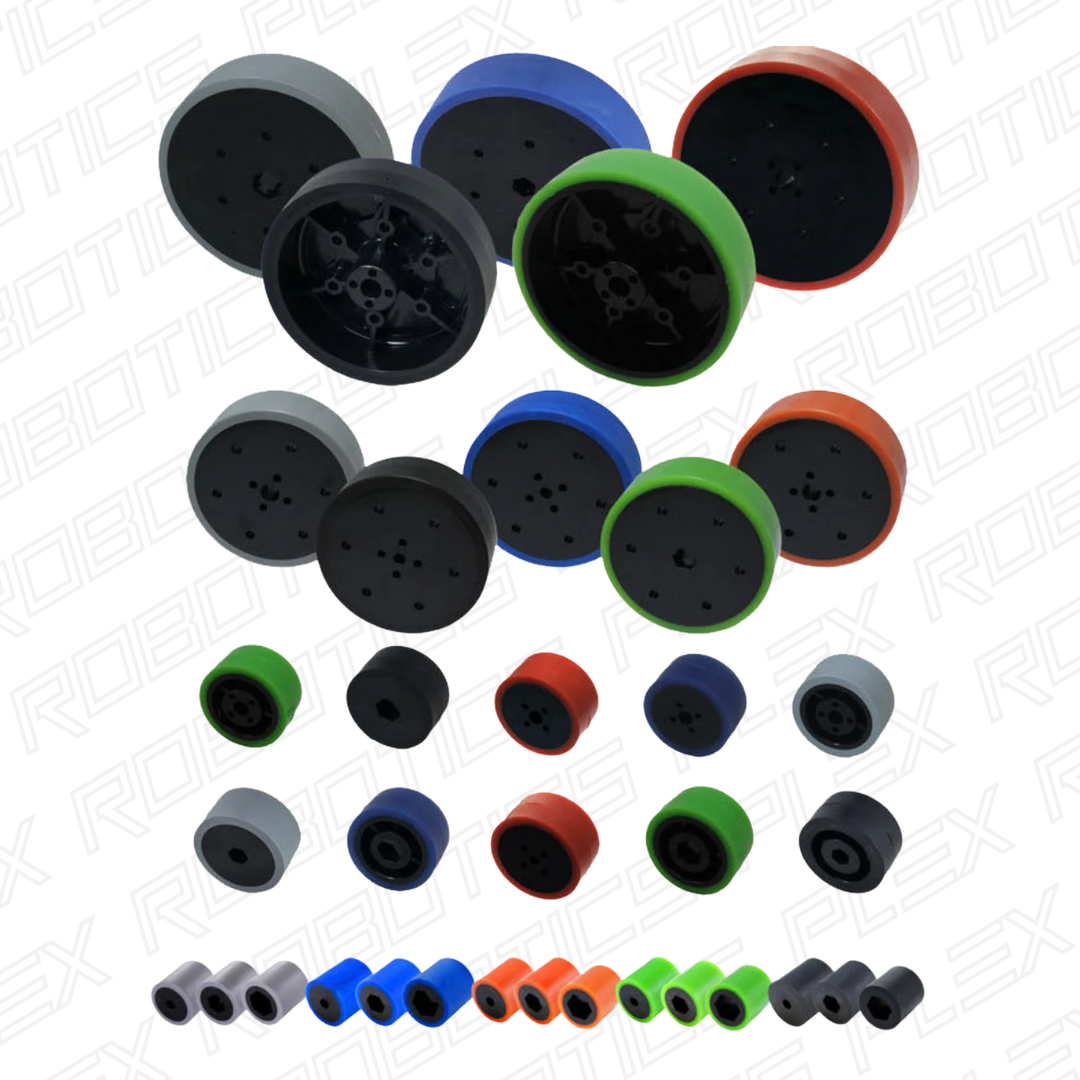 The inside black portion of these wheels are made from molded polycarbonate plastic. The outer tread is TPU (Thermoplastic PolyUrethane). This robust but lightweight wheel provides good traction on carpet and soft tiles. Stealth wheels are the perfect drive wheel for smaller (<50 lb.) robots, and both Stealth and Sushi rollers are great for intakes and other auxiliary robot mechanisms. These wheels are available in a variety of bores and durometers. 3 in. and 4 in. Stealth Wheels feature a 6 bolt pattern on a 1.875 in. bolt circle for mounting sprockets, hubs, and gears. Nub Bore Stealth Wheels feature a 4 bolt pattern on a 16 mm bolt circle found in most FIRST Tech Challenge building systems. The lower the durometer the softer the wheel is, this makes it wear away faster, but also makes it more grippy.